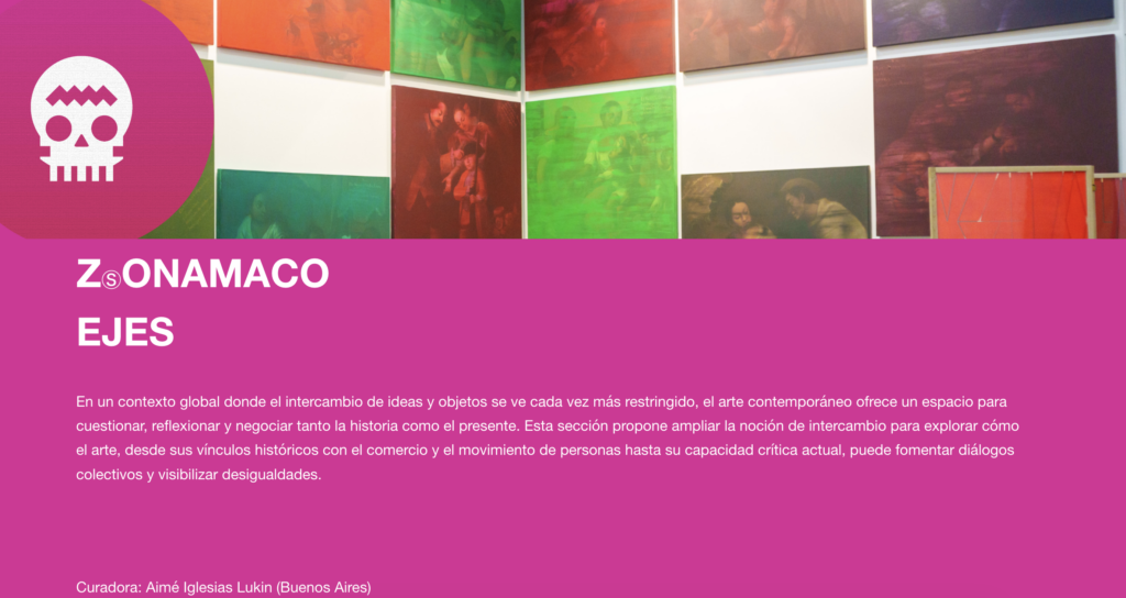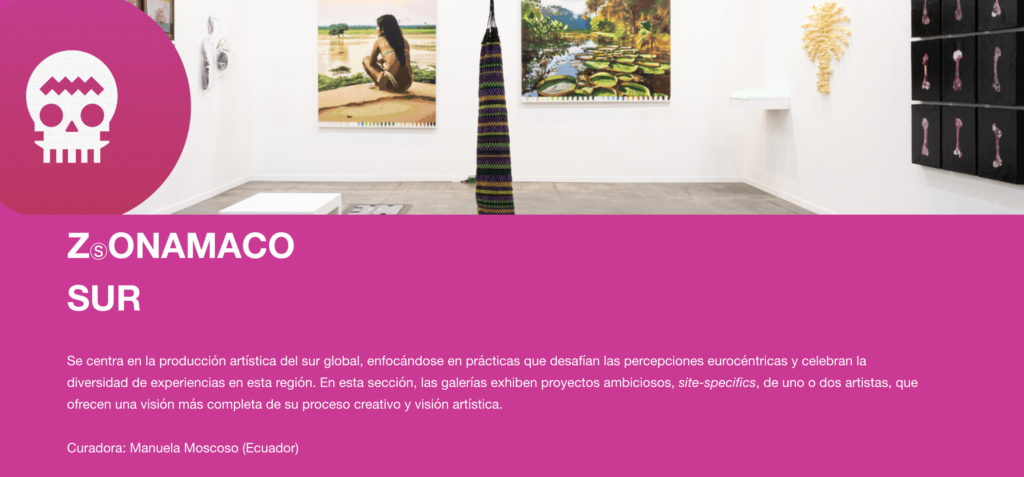 - ZONAMACO Sur: Una plataforma dedicada a visibilizar propuestas del sur global, especialmente de América Latina, que muchas veces quedan fuera de los circuitos comerciales hegemónicos.